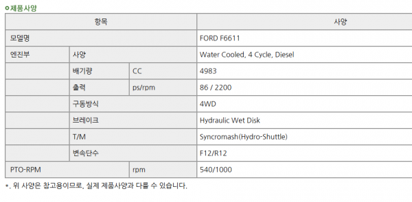 | 제조사 | 대동 | 모델명 | FORD F6611 | 규격 | 86마력 |