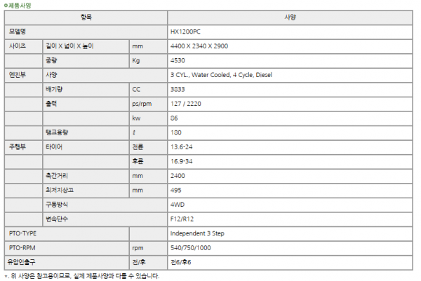 | 제조사 | 대동 | 모델명 | HX1200 | 규격 | 120-129hp |