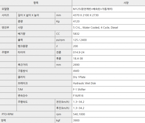 | 제조사 | 구보다 | 모델명 | M125 | 규격 | 125마력 |